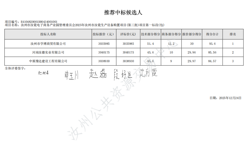 ******委员会对所有供应商投标文件的总分排序【详见附件4】5.各评委成员对所有供应商投标文件的分项评分明细【详见附件5】6.供应商投标文件被否决原因【无,详见附件6】7.被推荐供************财政局 联系电话:0375-****** 邮箱地址:****** 联系地址:汝州市望嵩中路116号10.供应商或其他利害关系人对本次公告如有异议,请按中华人民共和国财政部令第94号《政府采购质疑和投诉办法》的相关规定,在规定时间内,向采购人、采购代理机构、政府采购监督部门提出质疑、投诉等事宜。逾期未提交或未按照要求提交的质疑、投诉将不予受理。